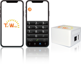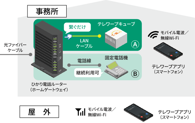 ひかり電話ルーターにテレワープキューブを接続するだけでスマホアプリでも事務所の固定電話が発信・着信出来るようになるサービスです。